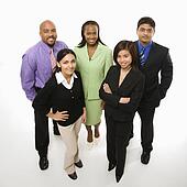 Portrait of multi-ethnic business group standing looking at viewer.